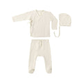 Our Take Home Set in soft, lightweight waffle fabric is the perfect outfit for welcoming your newborn. This sweet set includes a bonnet, a wrap snap and tie top, and footed drawstring pants.