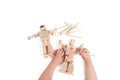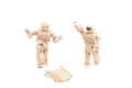 Wooden articulated action figures with blank surfaces for coloring.
