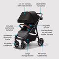 The Baby Jogger® city mini® air Lightweight Stroller is the compact stroller you need for everyday strolls that turn into unexpected adventures. With all-terrain rubber tires and all-wheel suspension, this low-profile baby stroller can go off the beaten path. Baby stays comfortable with a padded seat and canopy featuring a soft, breathable TENCEL™ blend that is sustainably sourced. You'll love the stylish premium leatherette used on the adjustable handlebar and belly bar. A compact, one-step fold and lightweight aluminum frame make for easy transportation and storage. The Harness Assist no-rethread stroller harness allows you to adjust the fit of the harness without rethreading—and a magnetic buckle makes in and out a snap. Kids will stay comfy with a reclining stroller seat, adjustable calf support, and Flex Tech stroller seat suspension that makes for the smoothest ride. The included infant car seat adapters are compatible with all Baby Jogger® and Graco® infant car seats to make your own travel system.