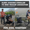 - Sleek jogging stroller to bike trailer crossover. Easily transitions from a jogging stroller to bike trailer and back again