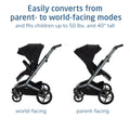 - Innovative, luxurious, fashion-forward stroller easily converts from parent- to world-facing modes and fits children up to 50 lbs. and 40" tall