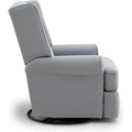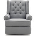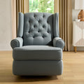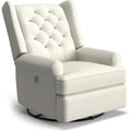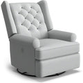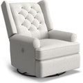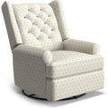 Style meets comfort with the Kendra swivel glider recliner.  The fine, made in the USA tailoring is evident with the button tufted back, clean lines, and updated wing back. The diverse fabric options can make a big impact in design. The size and styling make this recliner ideal for the living room, bedroom, den, or nursery.  The gliding base with a 360-degree* swivel feature is a functional and relaxing detail.