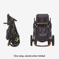 A one-step, compact fold makes it easy to store, and it is even self-standing.  The stroller can be folded with or without the seat attached. All four wheels are quick release which allow for an even smaller footprint especially when traveling by car.